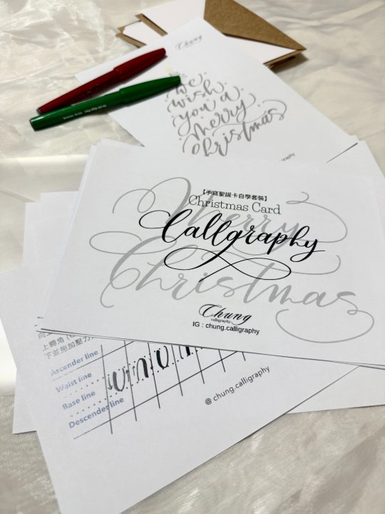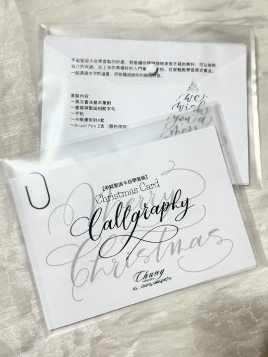 自學套裝可以讓你安在家中享受書寫的美好時光,無需刻意安排時間去上課,讓你按照自己的步調輕鬆學習。 用文字的溫度,向你敬愛的親友送上聖誕祝福。 自學套裝已包括筆記、練習紙、卡紙連信封4套和書法筆具(顏色隨機)。